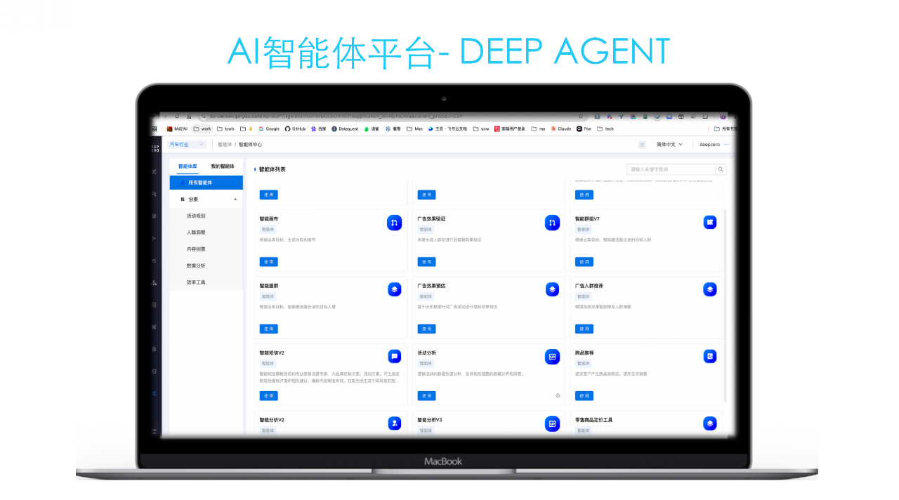 深耕垂类行业的业务 Know-How。基于ibet智能在消费品、金融、汽车等领域的十年深耕,Deep Agent 平台内置 300+ 行业专属决策模型与 5000+ 场景化解决方案模板,针对行业痛点设计专属场景,提供从数据治理到营销触达的一站式服务。